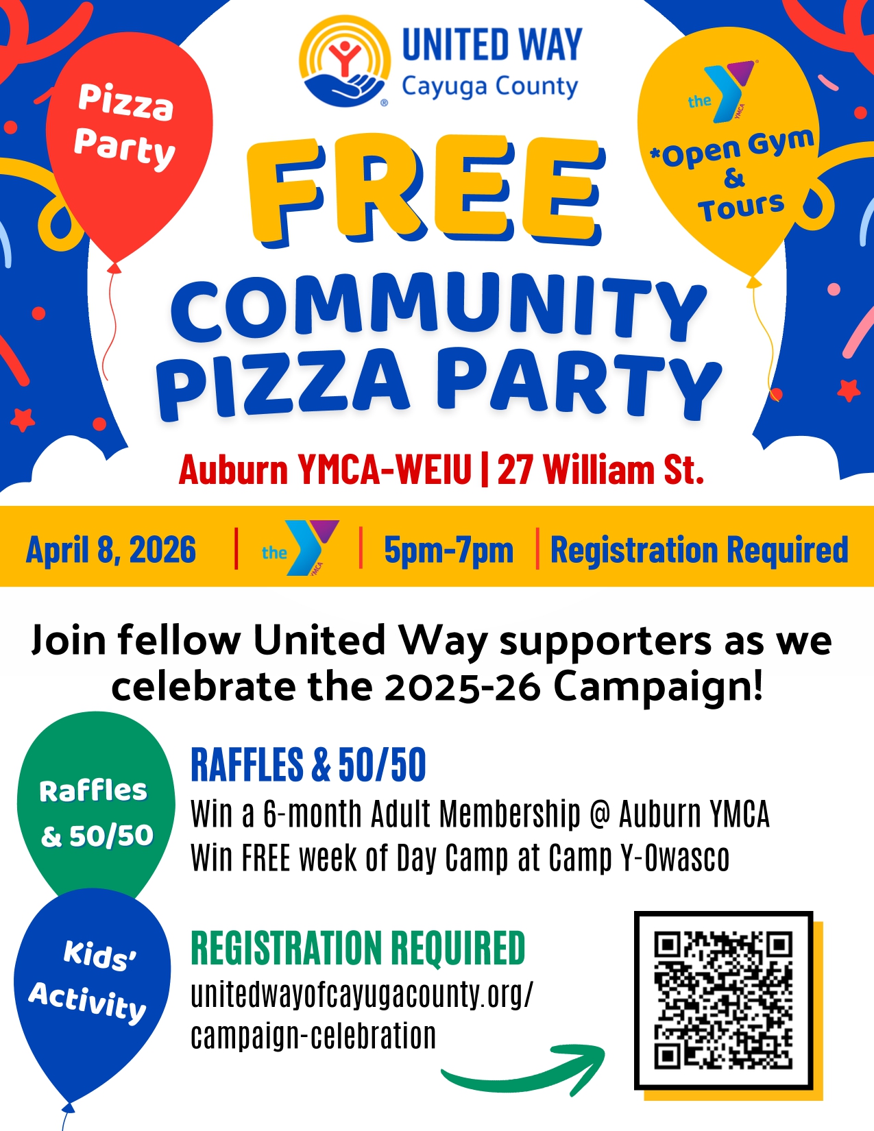 This FREE, family-friendly event celebrates the success of the 2025–26 United Way of Cayuga County Campaign. The evening will feature pizza, raffles, YMCA tours, a complimentary YMCA day pass (excluding pool and e-gym), and a children’s activity.
